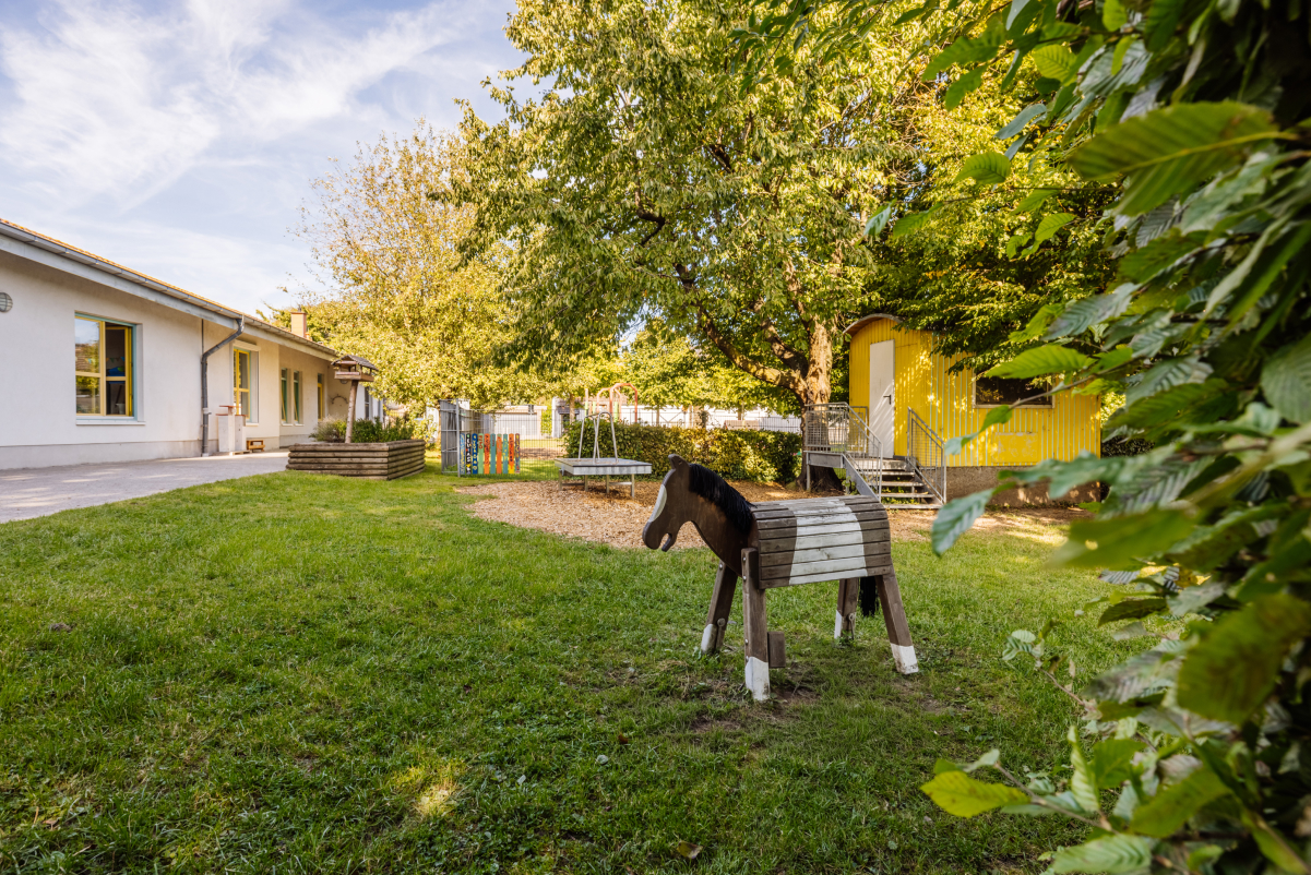 Unser großes Haus bietet viel Raum zum Spielen, Bewegen und Entdecken. Hohe Decken und große Fenster schaffen eine helle, einladende Atmosphäre. Auch unser weitläufiges Außengelände lädt dazu ein, sich zu bewegen, zu verstecken und die Natur zu erforschen. Die nahegelegene Kirche „St. Heinrich“ ist fußläufig erreichbar und bereichert unser gemeinsames Leben.