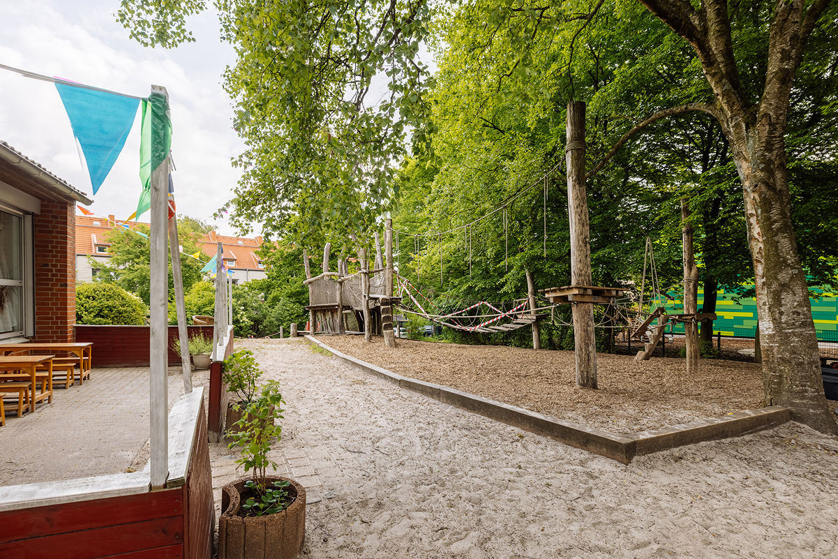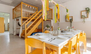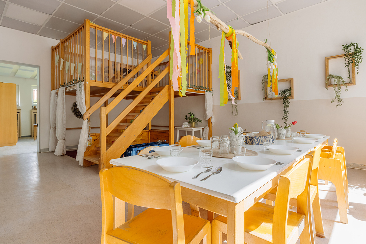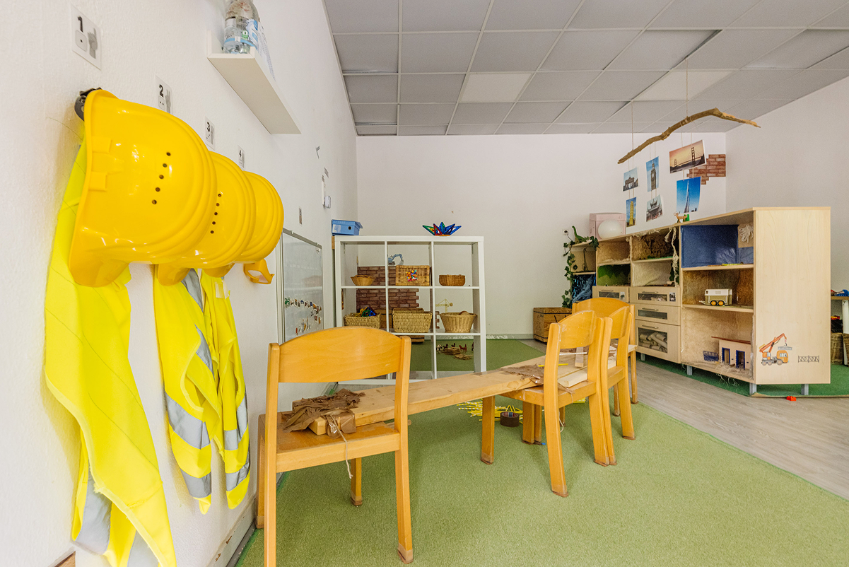 Unsere verschiedenen Werkstätten – darunter Theater, Atelier, Baustelle, Musikzimmer, Labor, Schreinerei und Ruheraum – ermöglichen den Kindern, spielerisch und selbstbestimmt die Welt zu entdecken. Ein besonderes Highlight ist unser großzügiges Außengelände sowie unser eigenes Restaurant mit Außenterrasse, in dem täglich frisch gekochte Mahlzeiten serviert werden.
