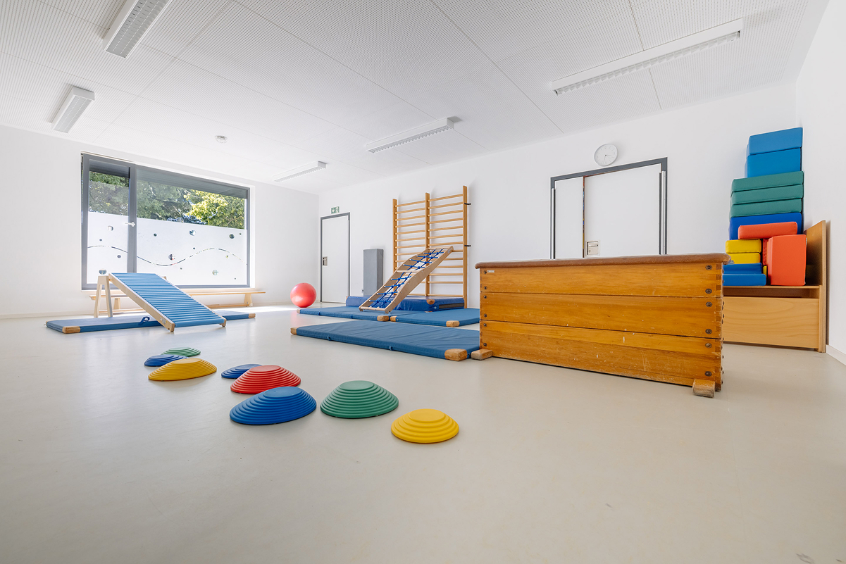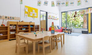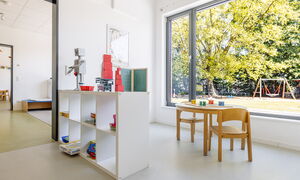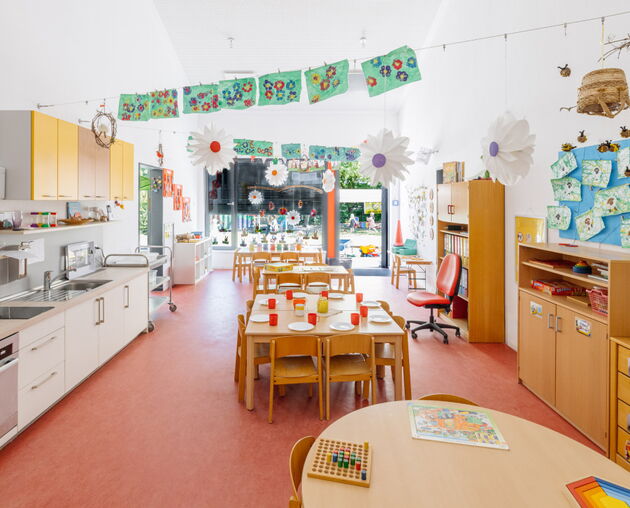 Unsere Kita überzeugt mit großzügigen Räumen, darunter Turnhalle, Kreativatelier, Maxiraum, Vorleseraum, ein großer Flur, sowie unserem weitläufigen Außengelände. Im teiloffenen Konzept des Ü3-Bereichs können die Kinder ihren Alltag aktiv mitgestalten und verschiedene Aktionsbereiche nutzen.