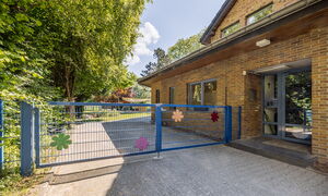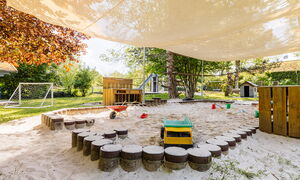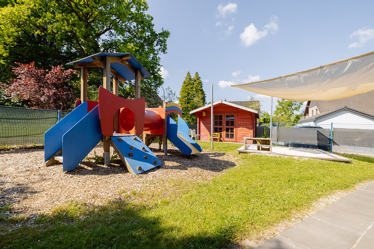 Besonders stolz sind wir auf unser großzügiges Außengelände. Alte Bäume spenden Schatten, ein Hochbeet lädt zum Gärtnern ein, und die Matschanlage fördert kreatives Spiel mit Wasser und Sand. Ein Kletterbaum unterstützt die motorische Entwicklung und regt die Fantasie an. Auch unser zweistöckiges Gebäude bietet mit einer großen Turnhalle und einem einladenden Flur vielfältige Spielmöglichkeiten.