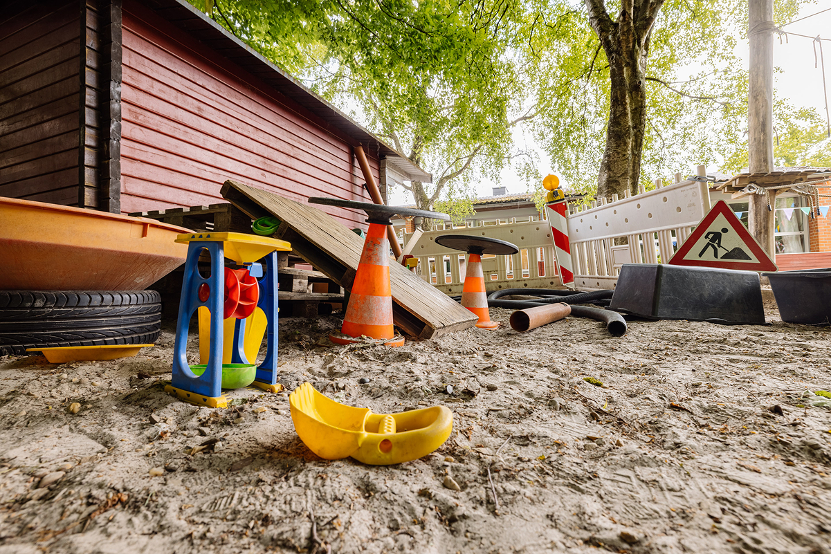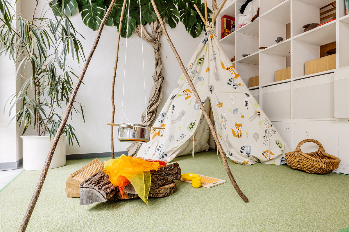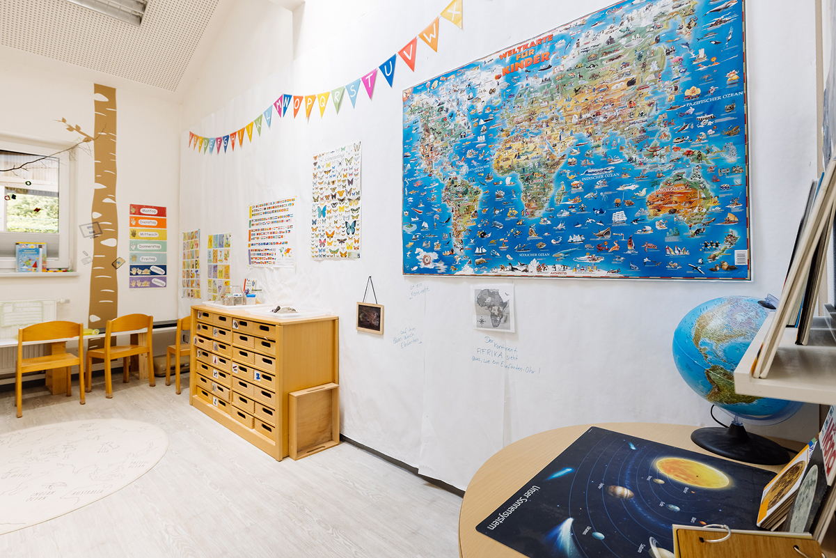 Unsere verschiedenen Werkstätten – darunter Theater, Atelier, Baustelle, Musikzimmer, Labor, Schreinerei und Ruheraum – ermöglichen den Kindern, spielerisch und selbstbestimmt die Welt zu entdecken. Ein besonderes Highlight ist unser großzügiges Außengelände sowie unser eigenes Restaurant mit Außenterrasse, in dem täglich frisch gekochte Mahlzeiten serviert werden.