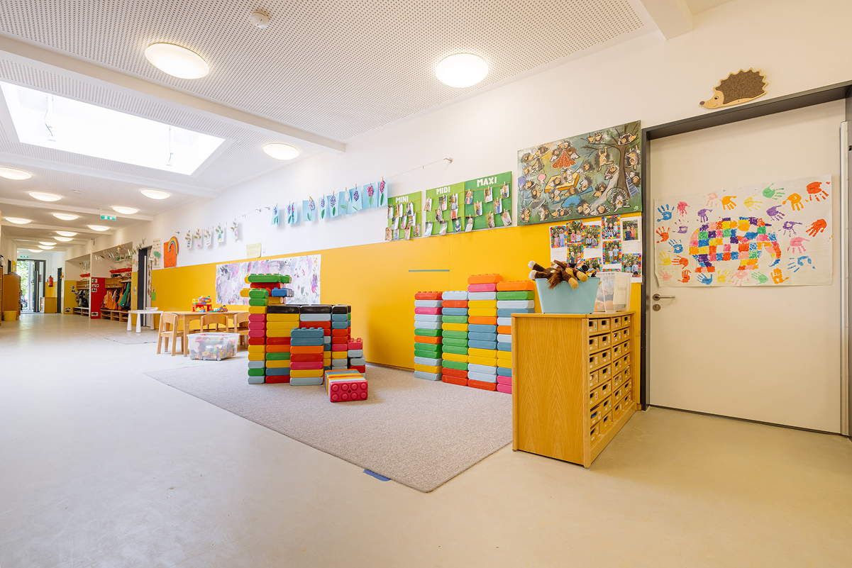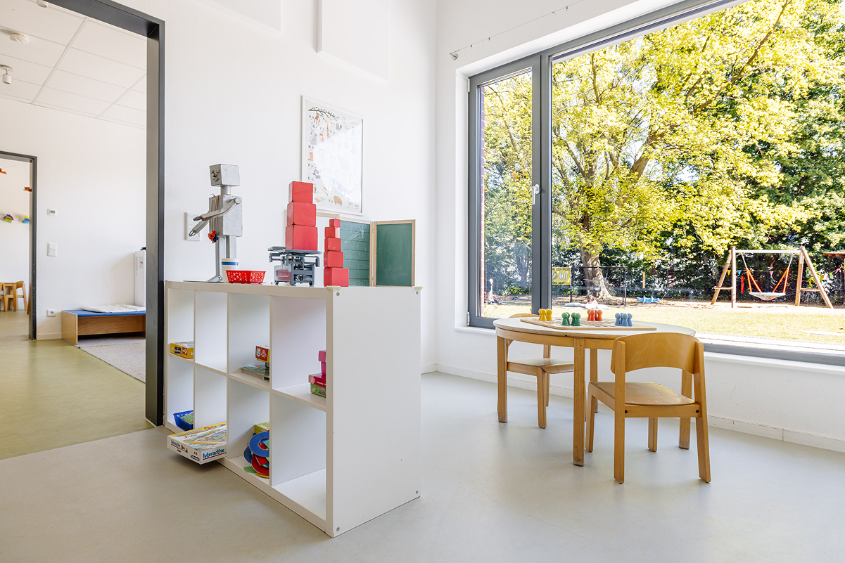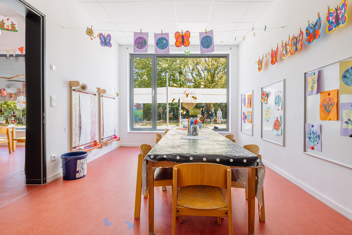 Unsere Kita überzeugt mit großzügigen Räumen, darunter Turnhalle, Kreativatelier, Maxiraum, Vorleseraum, ein großer Flur, sowie unserem weitläufigen Außengelände. Im teiloffenen Konzept des Ü3-Bereichs können die Kinder ihren Alltag aktiv mitgestalten und verschiedene Aktionsbereiche nutzen.